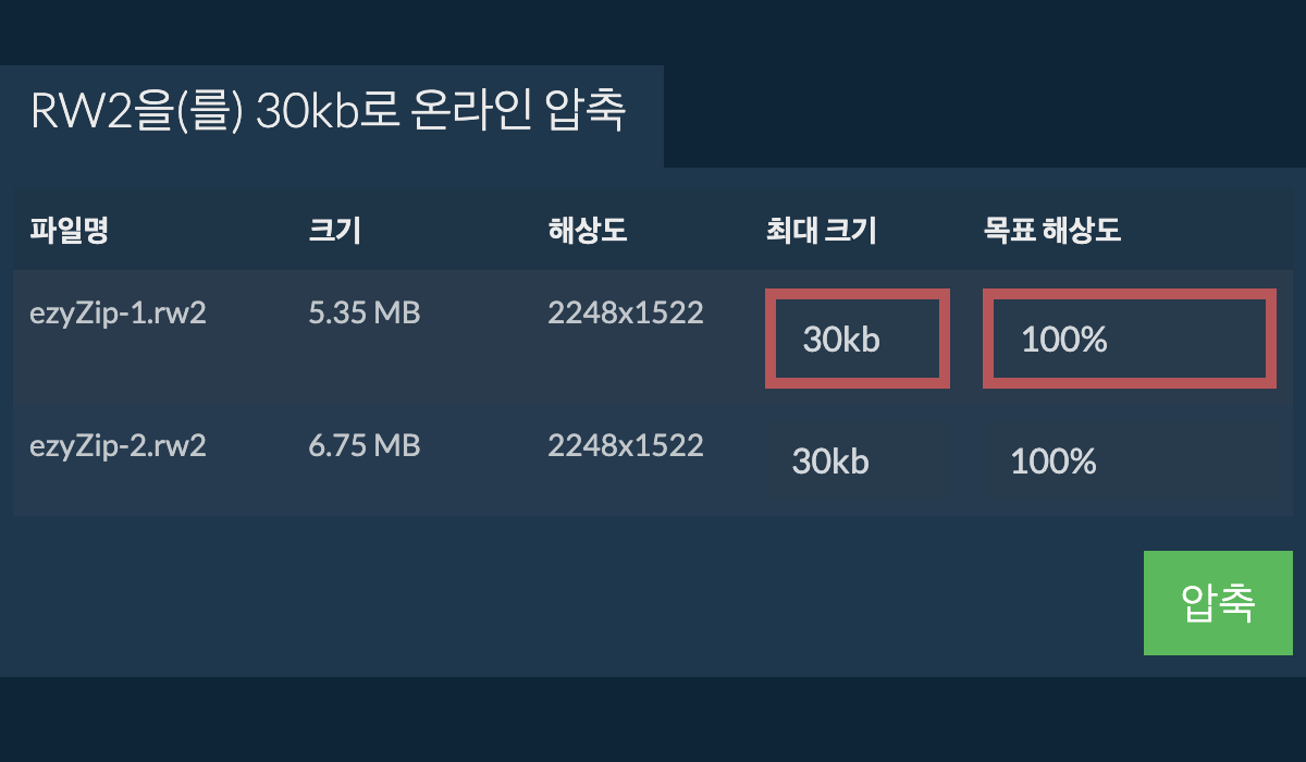 RW2 파일을 30kb로 어떻게 압축하나요?