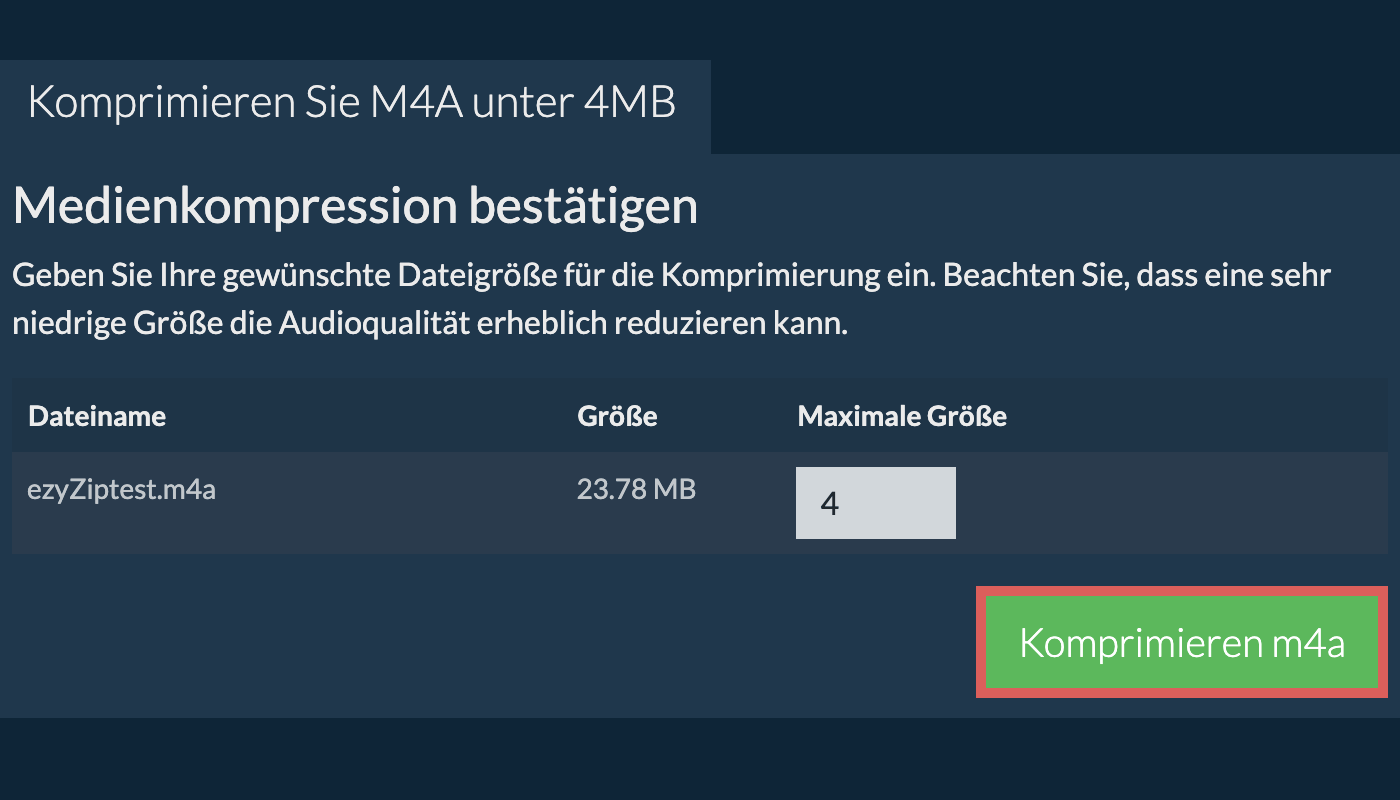 Klicken Sie auf "Wählen Sie m4a-Datei zum Komprimieren", um den Dateiauswahldialog zu öffnen - Klicken Sie auf "Komprimieren M4A". Der Komprimierungsprozess beginnt und dauert einige Zeit.