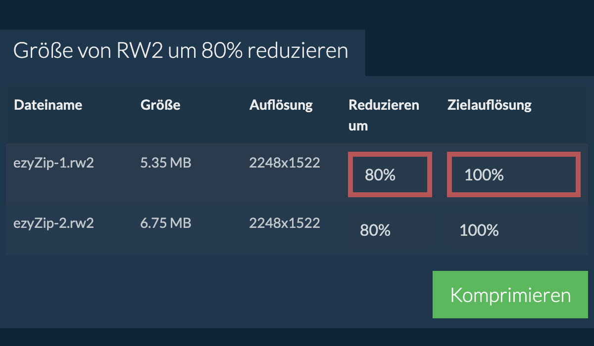ezyZip ist ein Set von Dienstprogrammen für den Umgang mit komprimierten Dateien. Es ist ein kostenloses Online-Tool, um Ihre Dateien auf eine kleinere Größe zu komprimieren, einschließlich dieses Tools zum Reduzieren von RW2-Dateien um 80%. Keine zusätzliche Softwareinstallation notwendig. Es unterstützt auch eine Vielzahl anderer Bildkomprimierungsoptionen.