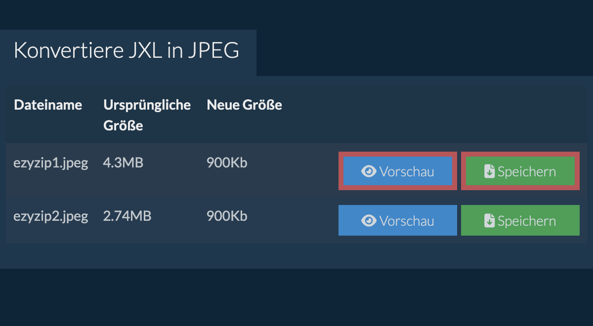 - Sobald alle Dateien konvertiert wurden, werden Ihnen die Dateien erneut präsentiert. Klicken Sie auf "Vorschau", um die neuen Bilder im Browser zu sehen. Wenn Sie damit zufrieden sind, klicken Sie auf "Speichern", um die konvertierten Dateien auf Ihrem Computer zu speichern.