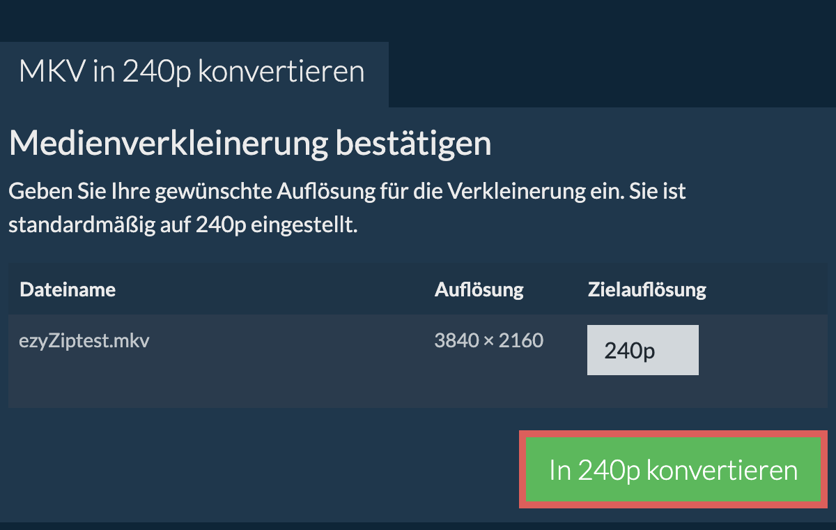 Klicken Sie auf "Wählen Sie mkv-Datei zum Komprimieren", um den Dateiauswahldialog zu öffnen - Klicken Sie auf "In 240p konvertieren". Der Verkleinerungsprozess beginnt und dauert einige Zeit.