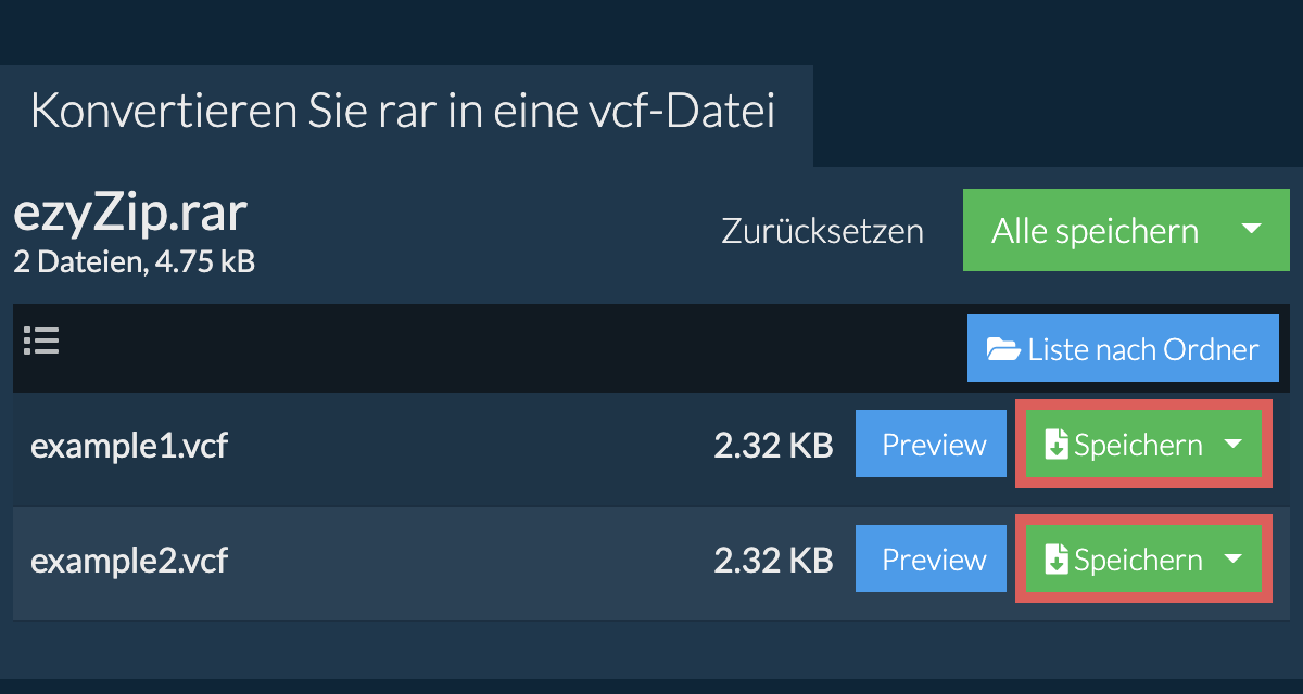 Klicken Sie auf „In VCF konvertieren“. Es werden alle VCF-Dateien im RAR-Archiv aufgelistet. - Klicken Sie auf die grüne Schaltfläche "Speichern", um einzelne VCF-Datei auf Ihrem lokalen Laufwerk zu speichern.