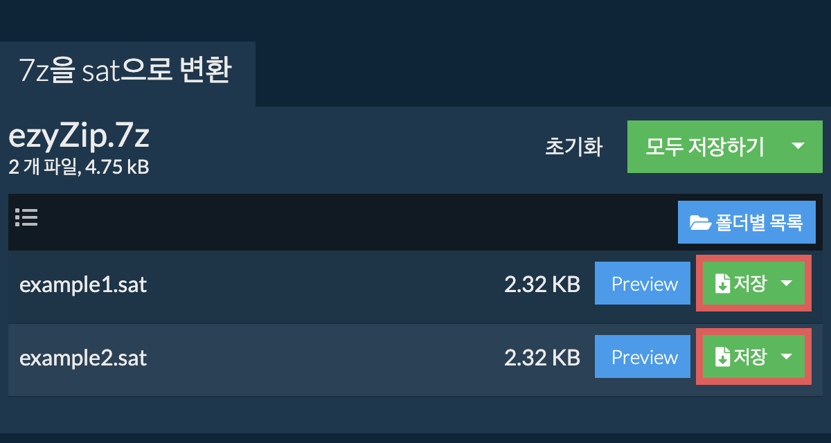 Zip 아카이브에 있는 모든 SAT 파일을 나열합니다. - 초록색 “저장” 버튼을 클릭하시면 로컬 드라이브에 개별 SAT 파일이 저장됩니다