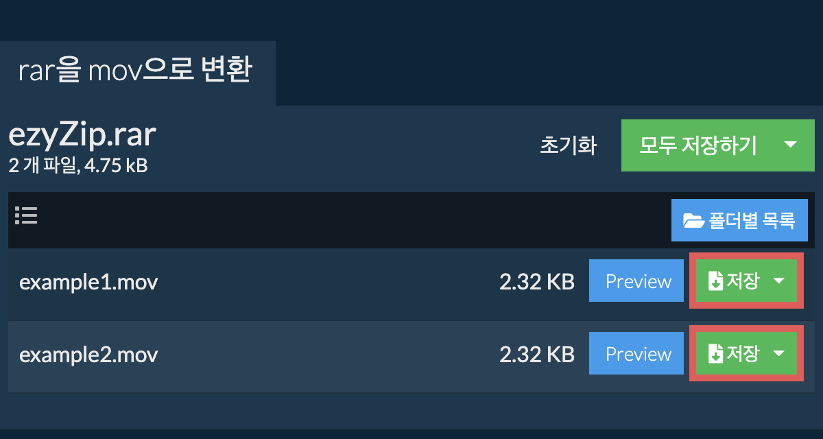 Zip 아카이브에 있는 모든 MOV 파일을 나열합니다. - 초록색 “저장” 버튼을 클릭하시면 로컬 드라이브에 개별 MOV 파일이 저장됩니다
