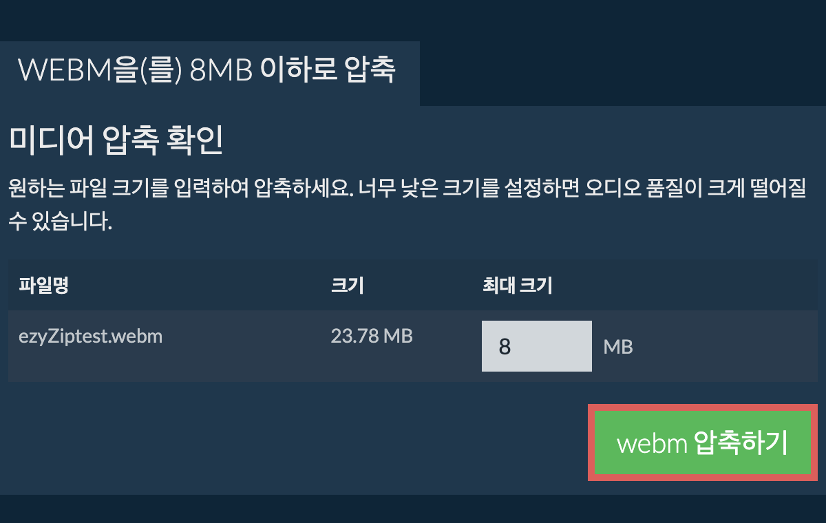 ezyZip을 사용하여 webm 파일 크기를 8MB 이하로 줄이는 단계는 다음과 같습니다.