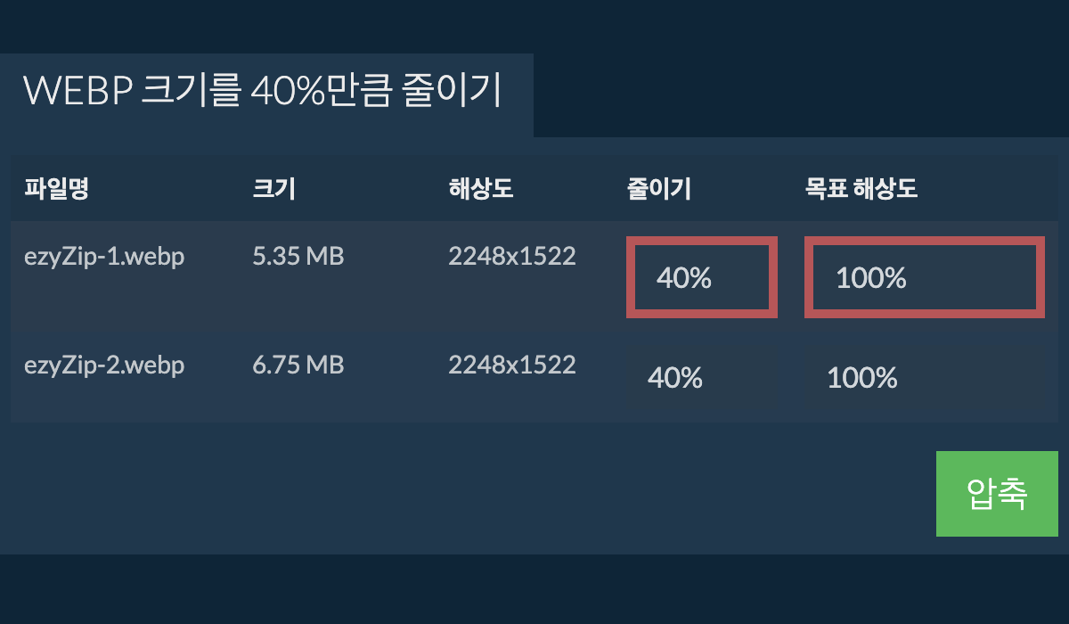 - 크기를 줄이고 싶은 파일을 선택하기 위해 "압축할 WEBP 선택"을 클릭하세요