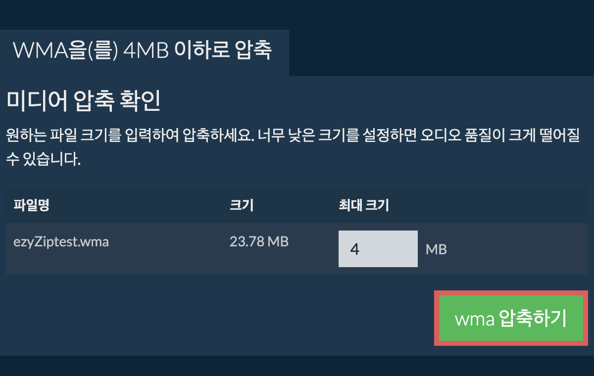 ezyZip은 브라우저에서 실행되는 무료 온라인 wma에서 4MB으로의 파일 크기 축소 도구입니다. 추가 압축 소프트웨어를 설치할 필요가 없습니다. 다른 미디어 압축도 다양하게 지원합니다.