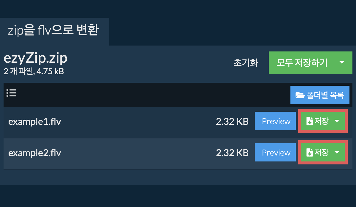 Zip 아카이브에 있는 모든 FLV 파일을 나열합니다. - 초록색 “저장” 버튼을 클릭하시면 로컬 드라이브에 개별 FLV 파일이 저장됩니다