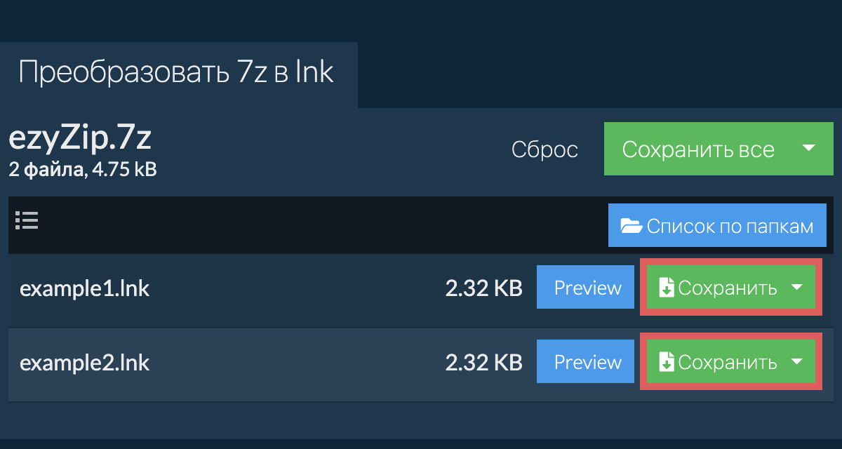 В нем будут перечислены все файлы LNK в 7Z-архиве. - Нажмите зеленую кнопку «Сохранить», чтобы сохранить отдельный файл LNK на локальном диске.
