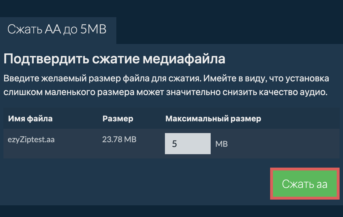 Нажмите "Выбрать файл aa для сжатия", чтобы открыть выбор файла - Нажмите "Сжать AA". Это начнет процесс сжатия, который займет некоторое время.