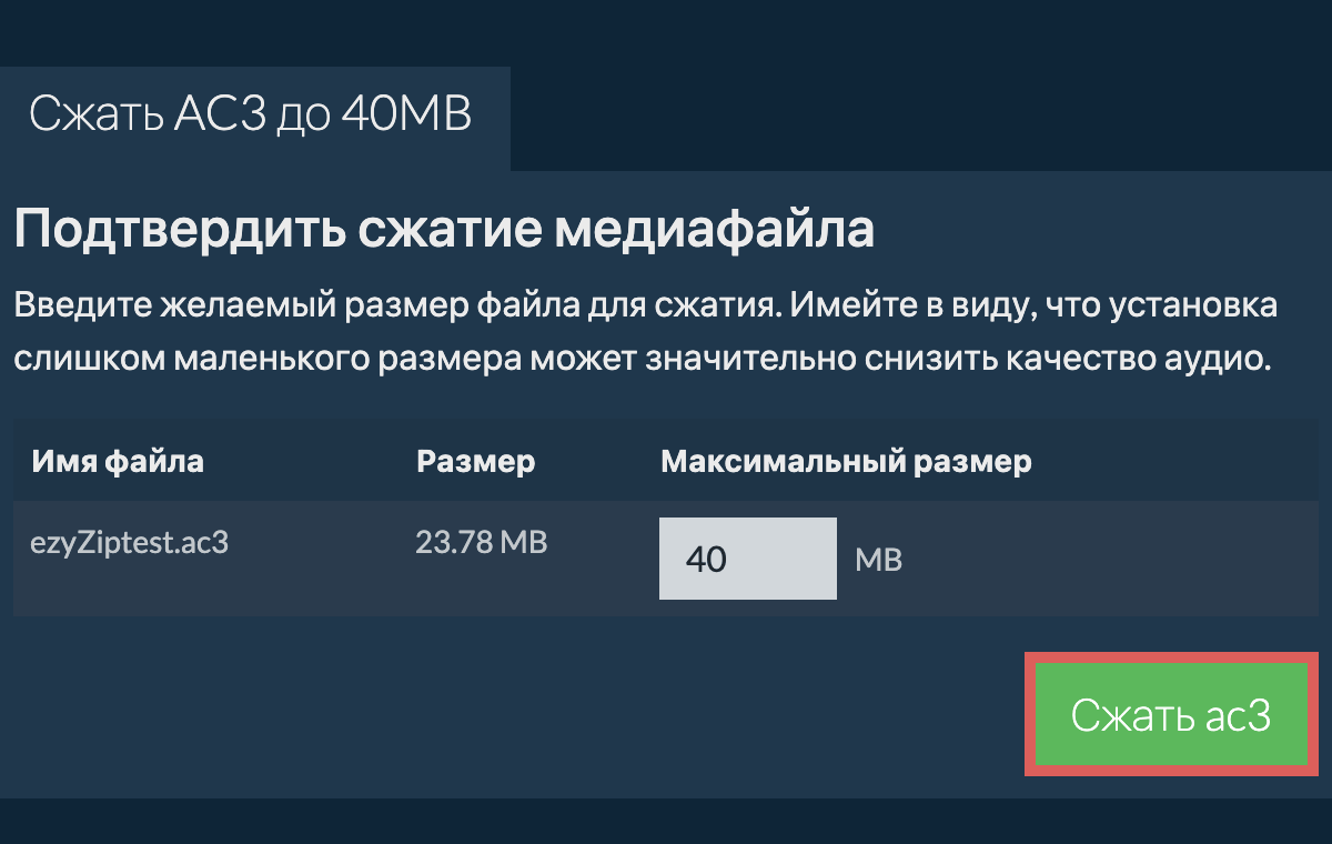 ezyZip - это бесплатный онлайн-инструмент для уменьшения размера файла из ac3 в 40MB, который работает в вашем браузере. Нет необходимости устанавливать дополнительное программное обеспечение для сжатия. Он также поддерживает множество других сжатий медиа.