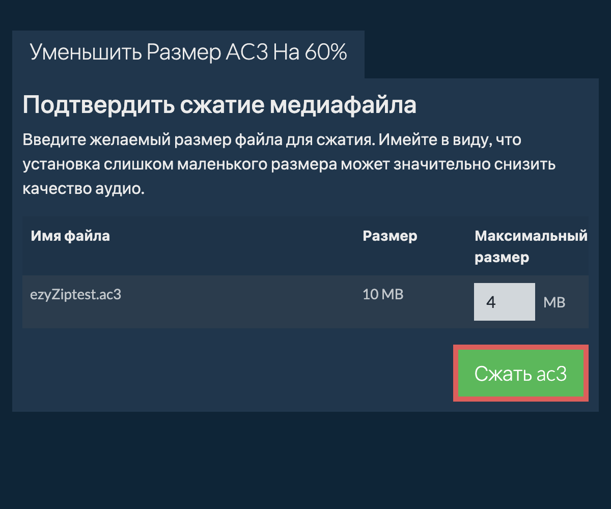 Нажмите "Выбрать файл ac3 для сжатия", чтобы открыть выбор файла - Нажмите "Сжать AC3". Начнется процесс сжатия, который займет некоторое время.