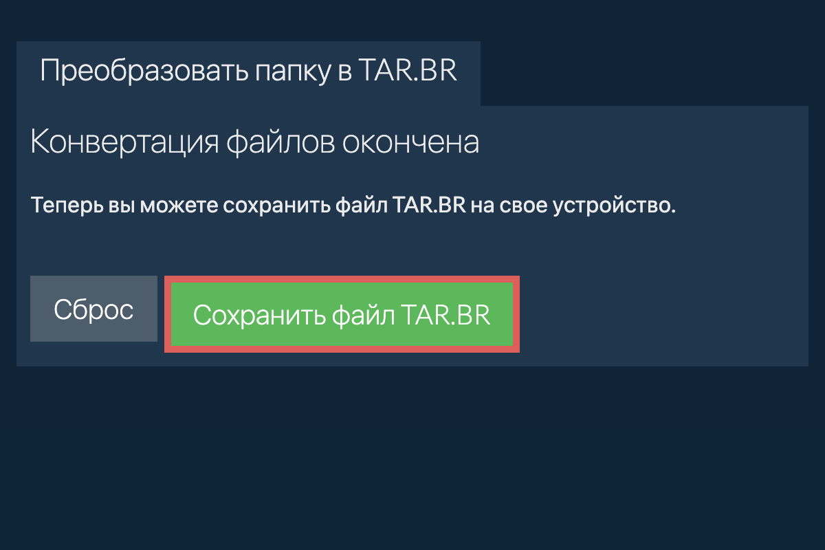 После обработки всех файлов появится кнопка "Сохранить файл TAR.BR". - Нажмите "Сохранить файл TAR.BR", чтобы сохранить архив папки в выбранную папку назначения.