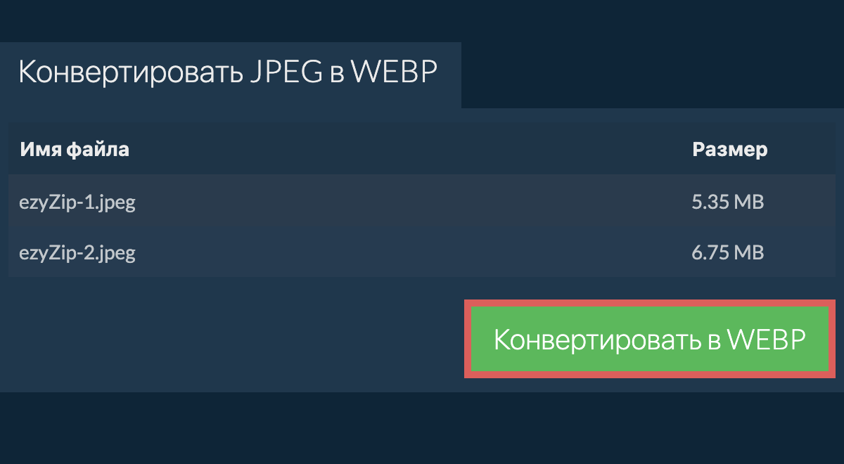 Пошаговая инструкция, показывающая, как конвертировать изображение из JPEG в WEBP онлайн с помощью ezyZip.