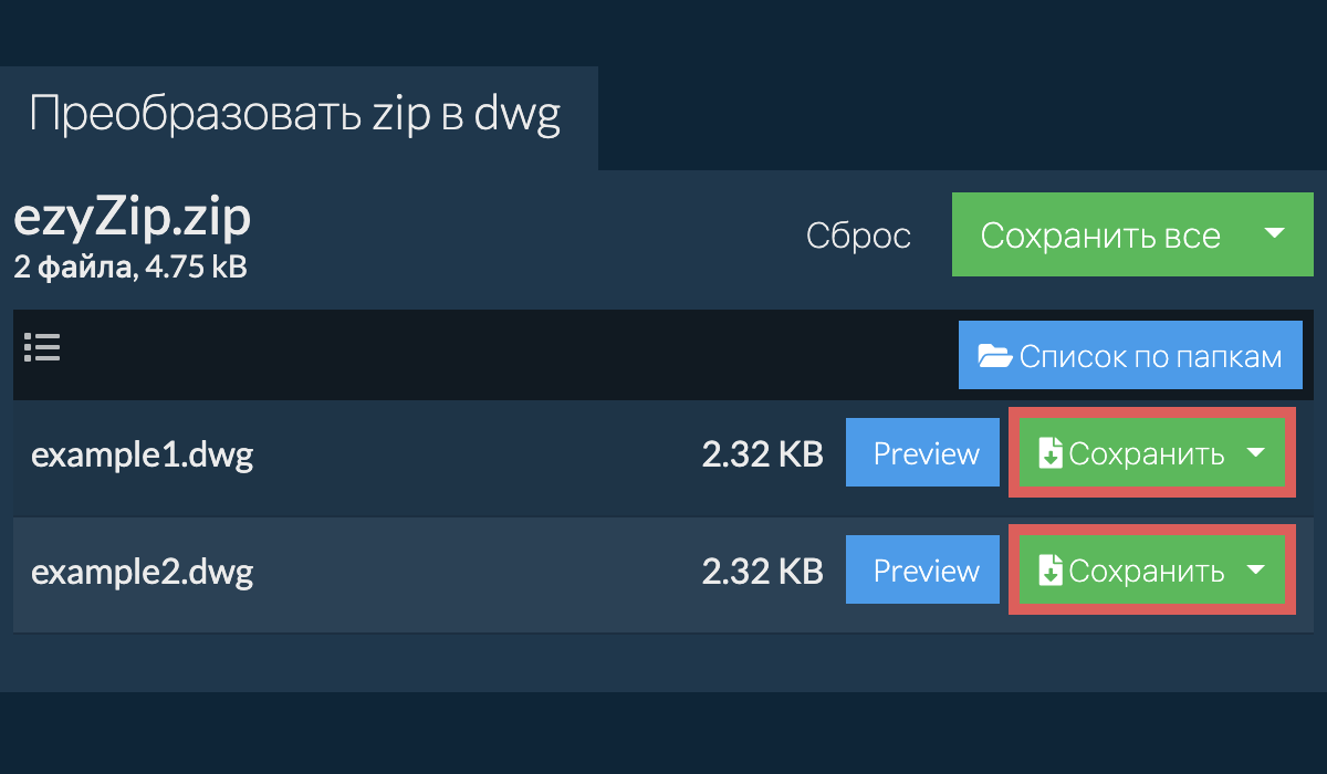 В нем будут перечислены все файлы DWG в ZIP-архиве. - Нажмите зеленую кнопку «Сохранить», чтобы сохранить отдельный файл DWG на локальном диске.