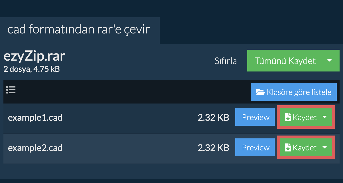 Arşivin içierisindeki CAD dosyanın listesini getirecektir. - CAD dosyayı tek tek seçip yerel depolamanıza kaydedebilmek için yeşil "Kaydet" düğmesine basın.