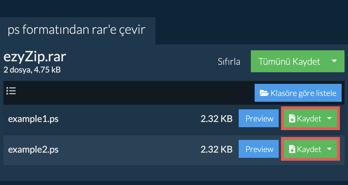 Arşivin içierisindeki PS dosyanın listesini getirecektir. - PS dosyayı tek tek seçip yerel depolamanıza kaydedebilmek için yeşil "Kaydet" düğmesine basın.