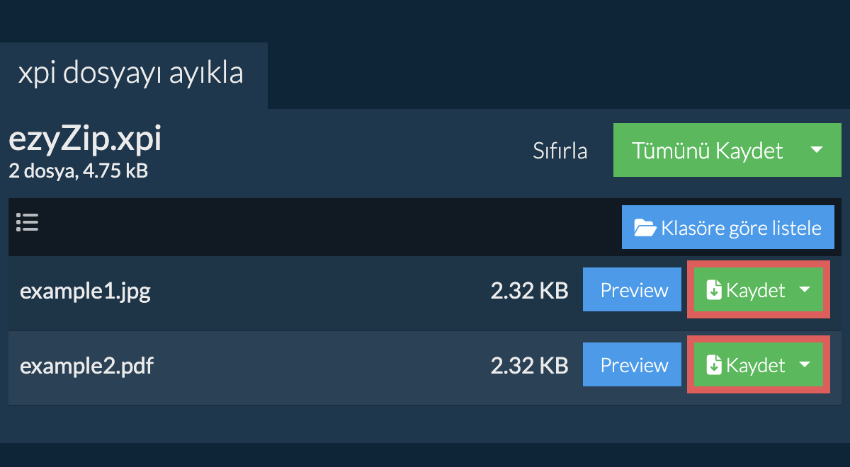 Dosya çıkarma işlemi başlatılacaktır ve işlem tamamlandığında XPI dosyasının içerikleri listelenecektir - Kaydetmek istediğiniz dosyaları yeşil "Kaydet" düğmesine tıklayarak yerel depolamanıza indirin.