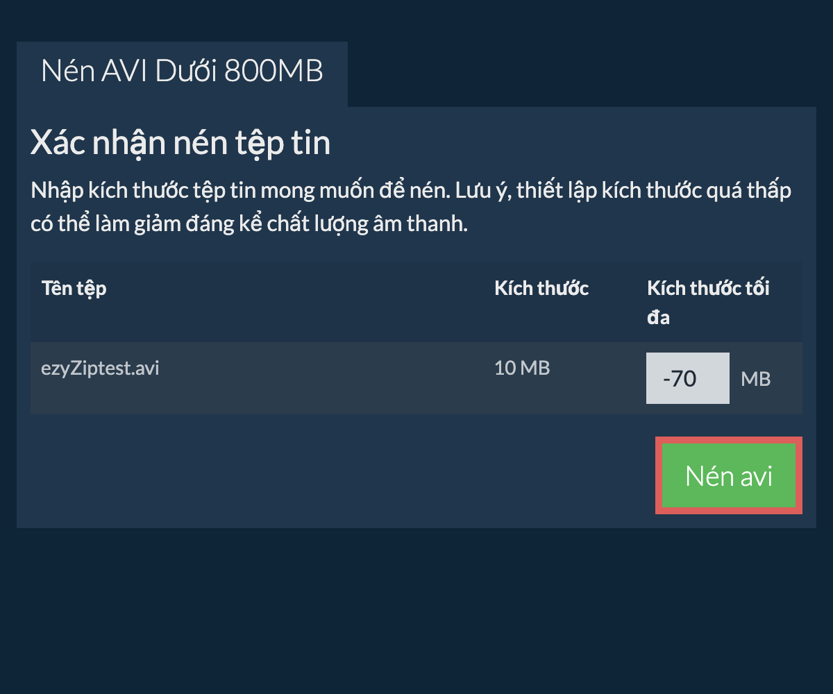 ezyZip là một công cụ giảm kích thước tệp từ avi sang 800MB miễn phí trực tuyến chạy trên trình duyệt của bạn. Không cần cài đặt thêm phần mềm nén. Nó hỗ trợ nhiều phương thức nén phương tiện khác nữa.