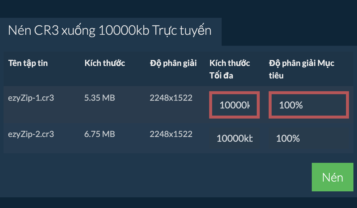 Làm thế nào để nén tập tin CR3 xuống 10000kb?