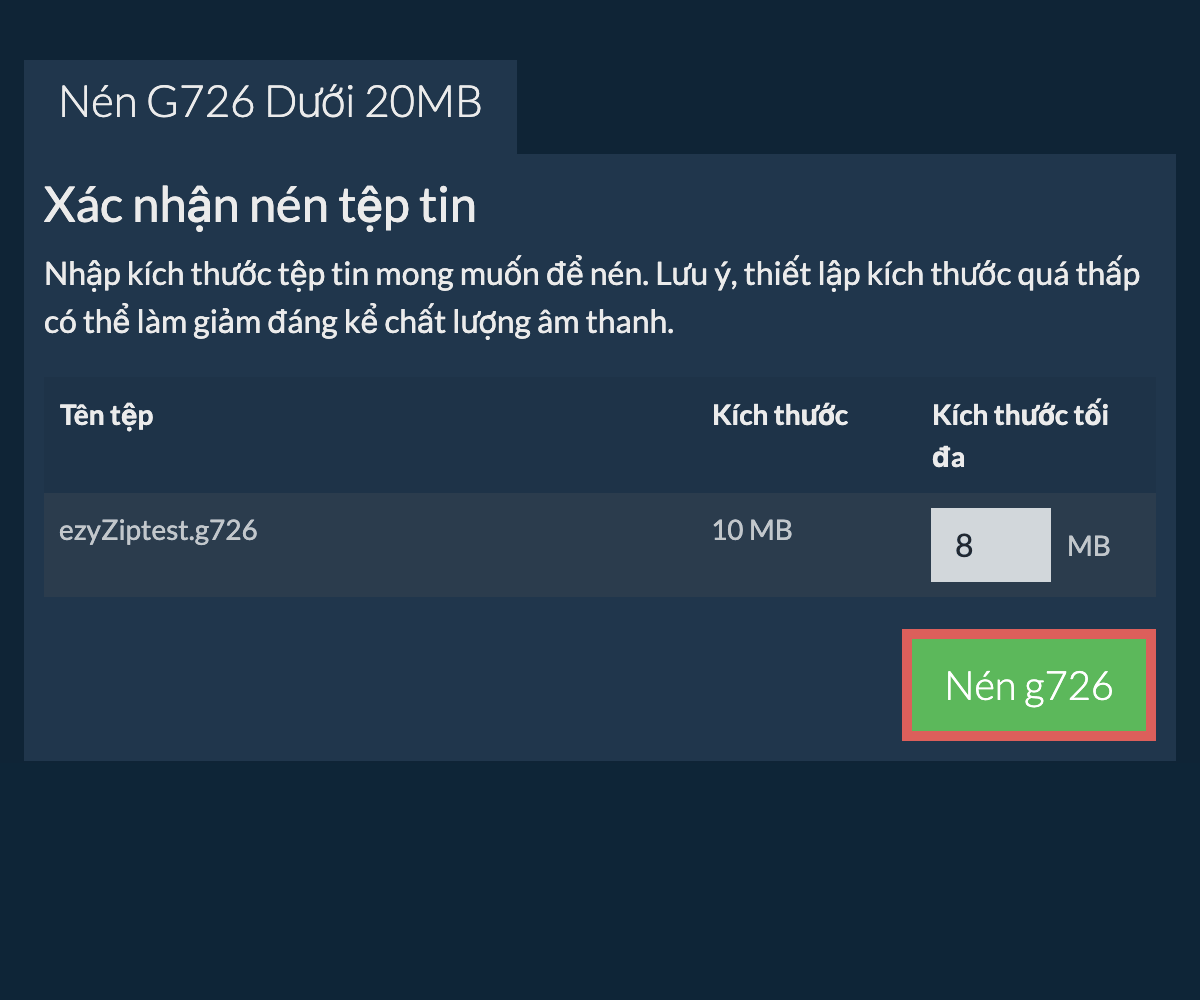 ezyZip là một công cụ giảm kích thước tệp từ g726 sang 20MB miễn phí trực tuyến chạy trên trình duyệt của bạn. Không cần cài đặt thêm phần mềm nén. Nó hỗ trợ nhiều phương thức nén phương tiện khác nữa.