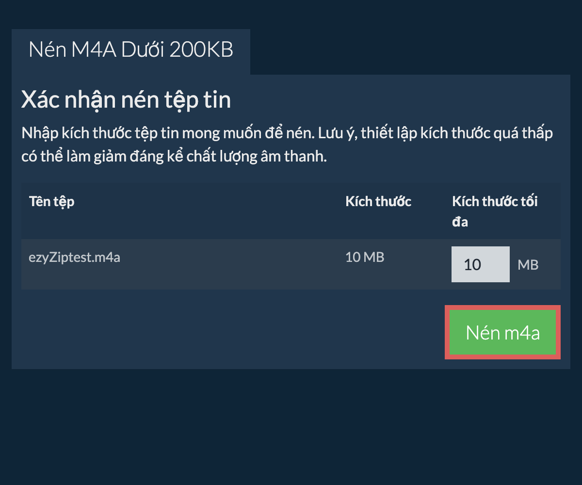 ezyZip là một công cụ giảm kích thước tệp từ m4a sang 200KB miễn phí trực tuyến chạy trên trình duyệt của bạn. Không cần cài đặt thêm phần mềm nén. Nó hỗ trợ nhiều phương thức nén phương tiện khác nữa.