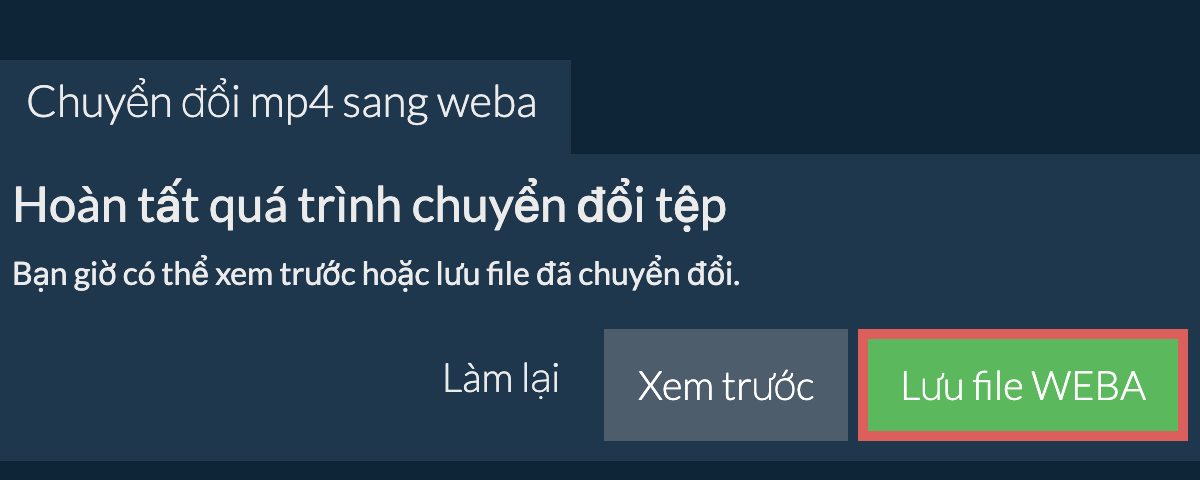 Nhấp vào "Chọn file MP4 để chuyển đổi" để mở bộ chọn file - Nhấp vào "Chuyển đổi sang WEBA". Quá trình chuyển đổi sẽ bắt đầu và mất một thời gian để hoàn thành.