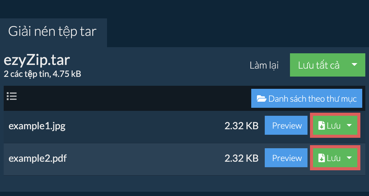 ezyZip sẽ bắt đầu giải nén tệp và liệt kê nội dung của tệp TAR sau khi hoàn tất. - Nhấp vào nút "Lưu" màu xanh lục trên các tệp riêng lẻ để lưu vào ổ đĩa cục bộ của bạn.