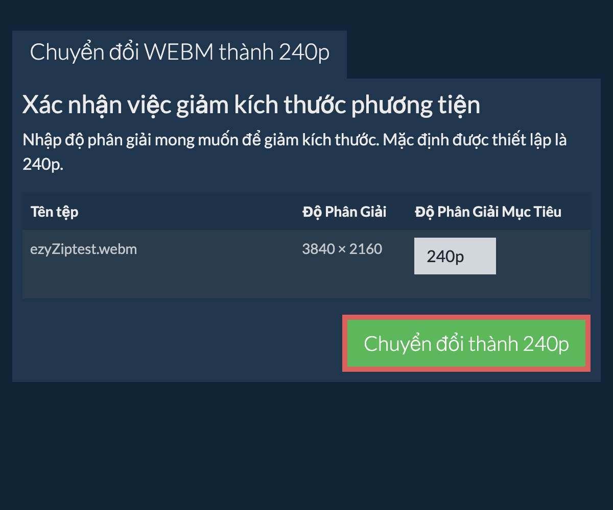ezyZip là công cụ giảm độ phân giải từ webm xuống 240p trực tuyến miễn phí chạy trên trình duyệt của bạn. Không cần cài đặt thêm phần mềm nén. Hỗ trợ nhiều loại phương tiện truyền thông và độ phân giải khác nhau.