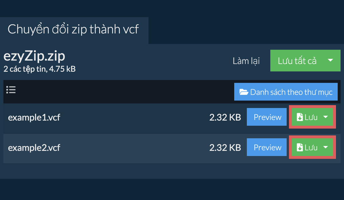 ezyZip sẽ liệt kê tất cả tệp VCF trong kho lưu trữ ZIP. - Nhấp vào nút "Lưu" màu xanh lục để lưu tệp VCF riêng lẻ vào ổ đĩa cục bộ của bạn.