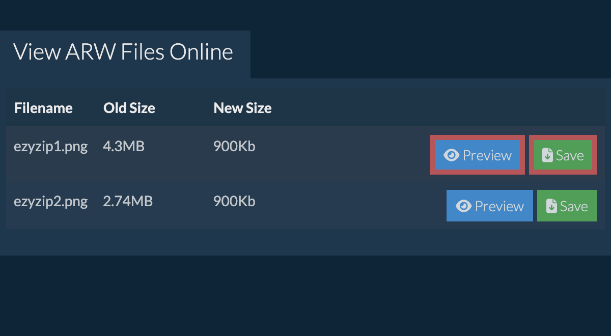 ezyZip provides tools for managing different file types. This specific utility allows for online viewing of ARW files, with an option to download the images as high-quality PNG files to your computer.