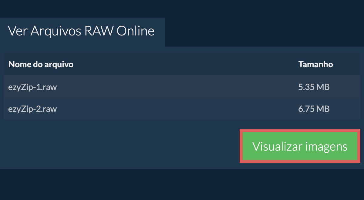 ezyZip fornece ferramentas para gerir diferentes tipos de arquivos. Esta utilidade específica permite a visualização online de arquivos RAW, com a opção de baixar as imagens como arquivos PNG de alta qualidade no seu computador.